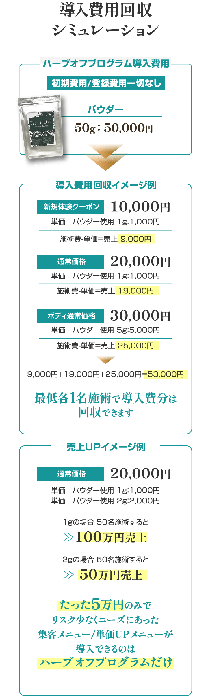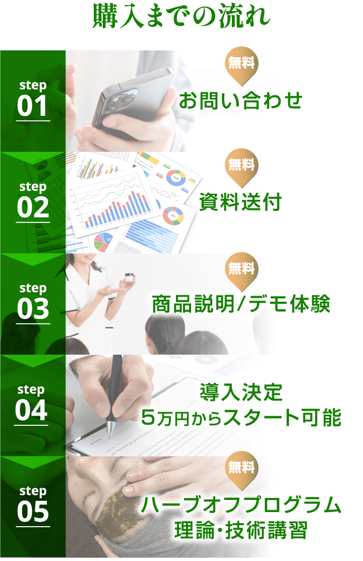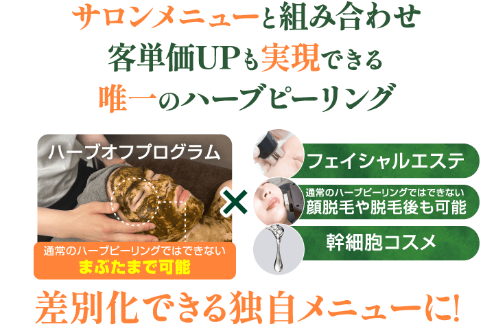 ハーブオフプログラムは50g5万円でサロン様にご導入いただけます。よくあるハーブピーリングの導入の際に何十万の契約やまとめての仕入れなどが必要ではございませんので、まずはハーブピーリングのメニューを導入して結果がでるかどうかを試したいオーナー様にとってお試ししやすい価格となっております。