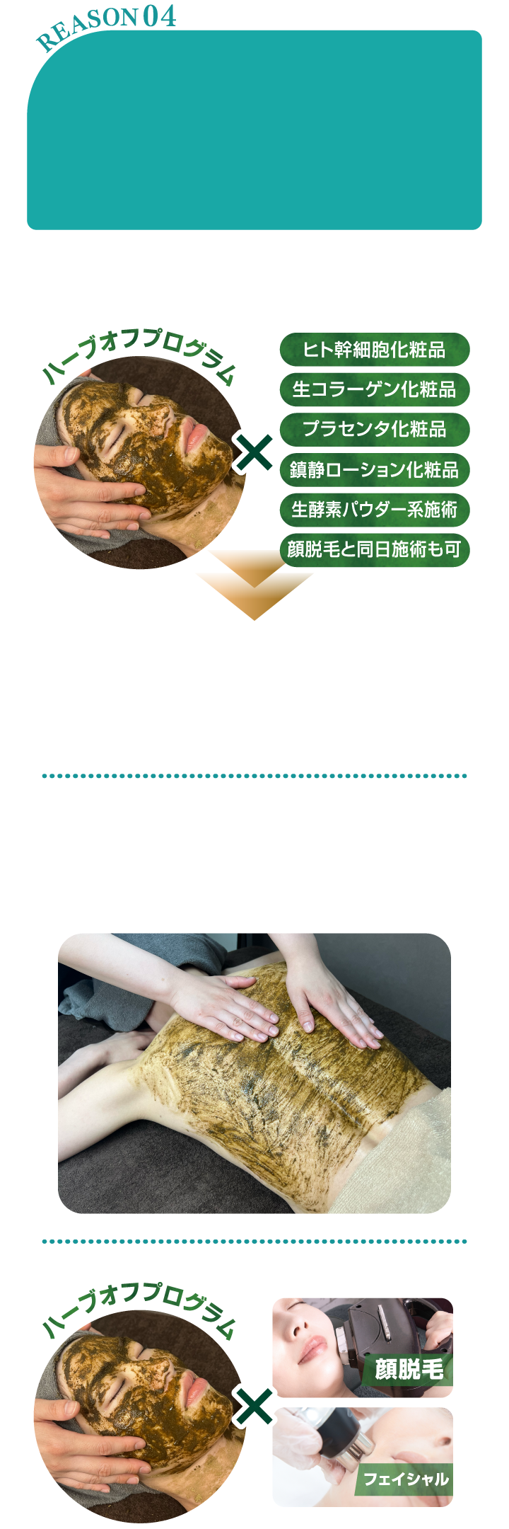 ハーブオフプログラムに含まれているハーブの中にはアレルギー反応や副反応がないものを限りなく使用させていただいておりますが妊娠中の方はホルモンバランスの影響がありますのでお控えくださいませ。子供や大人まで使用できるパウダーとなっております。お肌のニキビやアトピーなどの重症度の高い方についても施術が可能ではありますが、パッチテストをお客様の安心のために実施することを推奨させていただいております。